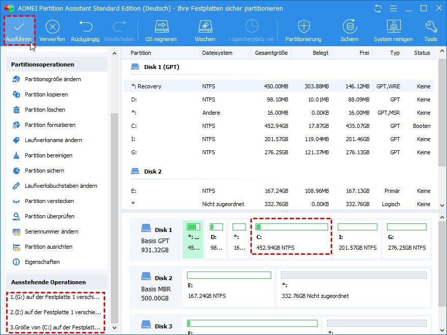Klicken Sie einfach mit der rechten Maustaste auf das Zielvolume, wählen Sie „Partition verschieben/Größe ändern“ und ziehen Sie den Rand in Richtung des leeren Bereichs, um das Volume zu erweitern. Klicken Sie danach auf „Ausführen“, um die Vorgänge zu übermitteln.