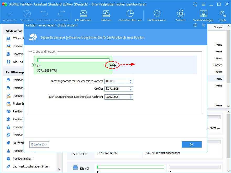 Die Funktion „Partition verschieben/Größe ändern“ kann das Volumen auf den angrenzenden nicht zugeordneten Speicherplatz erweitern, unabhängig davon, ob er sich auf der rechten oder linken Seite befindet.