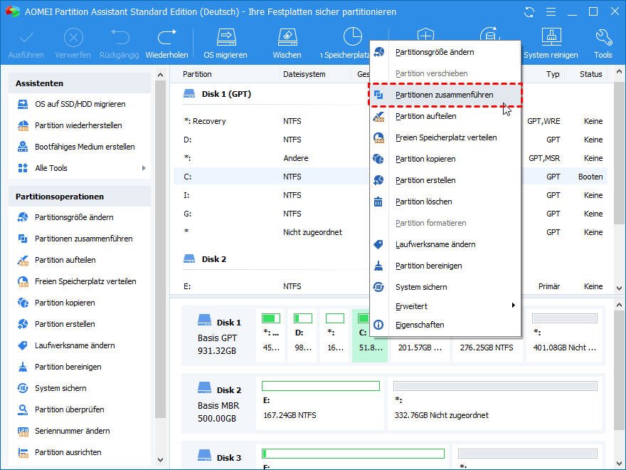 Schritt 1. Installieren und führen Sie AOMEI Partition Assistant aus. Klicken Sie mit der rechten Maustaste auf die Partition, die Sie erweitern möchten, und wählen Sie im Dropdown-Menü „Erweitert“ ⇨ „Partitionen zusammenführen“.