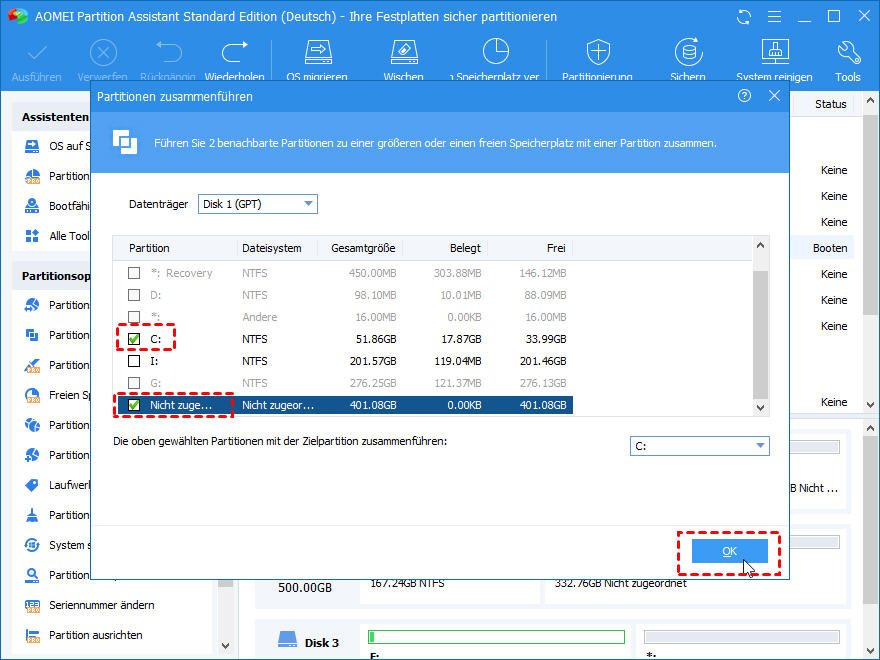 Es verfügt über die Funktion „Partitionen zusammenführen“, mit der Sie innerhalb von 3 Schritten angrenzenden oder nicht angrenzenden, nicht zugeordneten Speicherplatz mit dem Zielvolume zusammenführen können.
