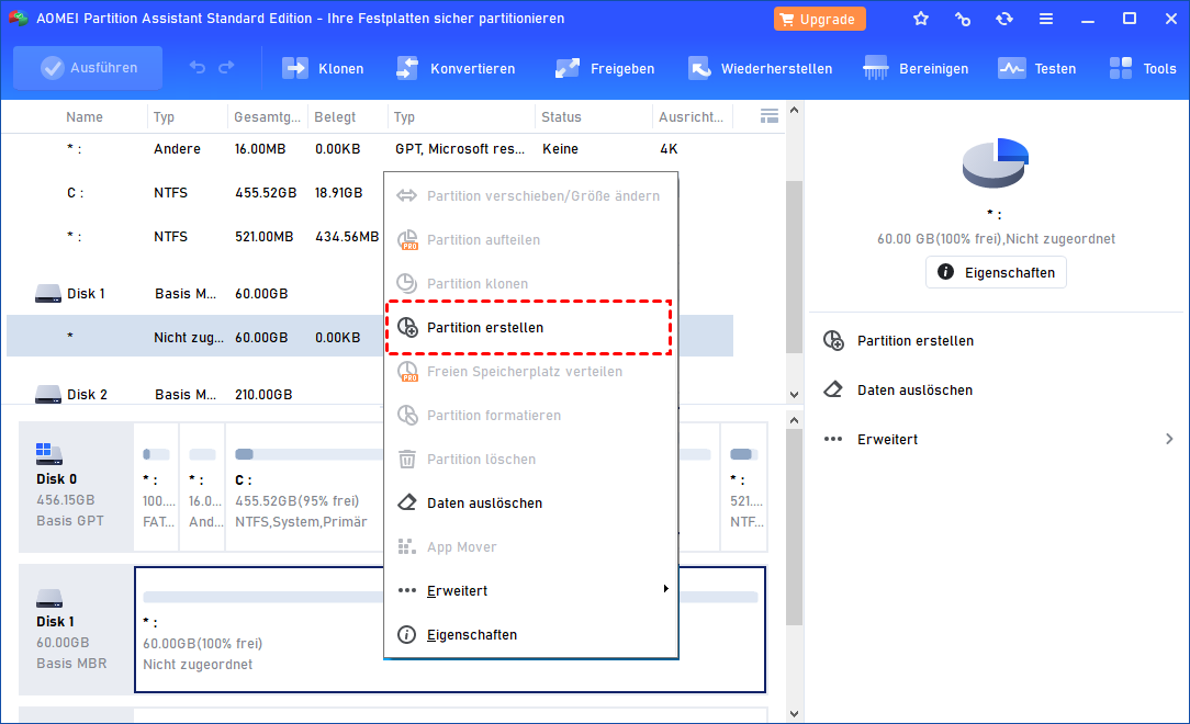 Schritt 1. Laden Sie AOMEI Partition Assistant herunter und öffnen Sie es. Klicken Sie mit der rechten Maustaste auf das Laufwerk E und wählen Sie Partition erstellen.