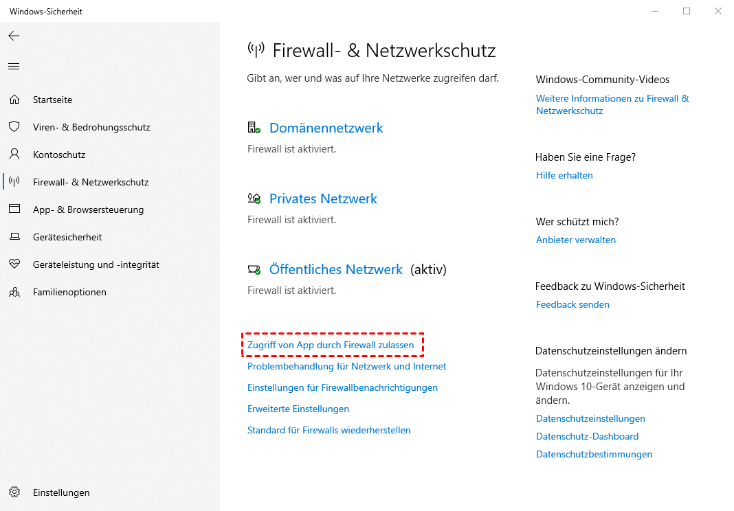 Schritt 2. Klicken Sie auf „Firewall- & Netzwerkschutz“ und „Zugriff von App durch Firewall zulassen“.