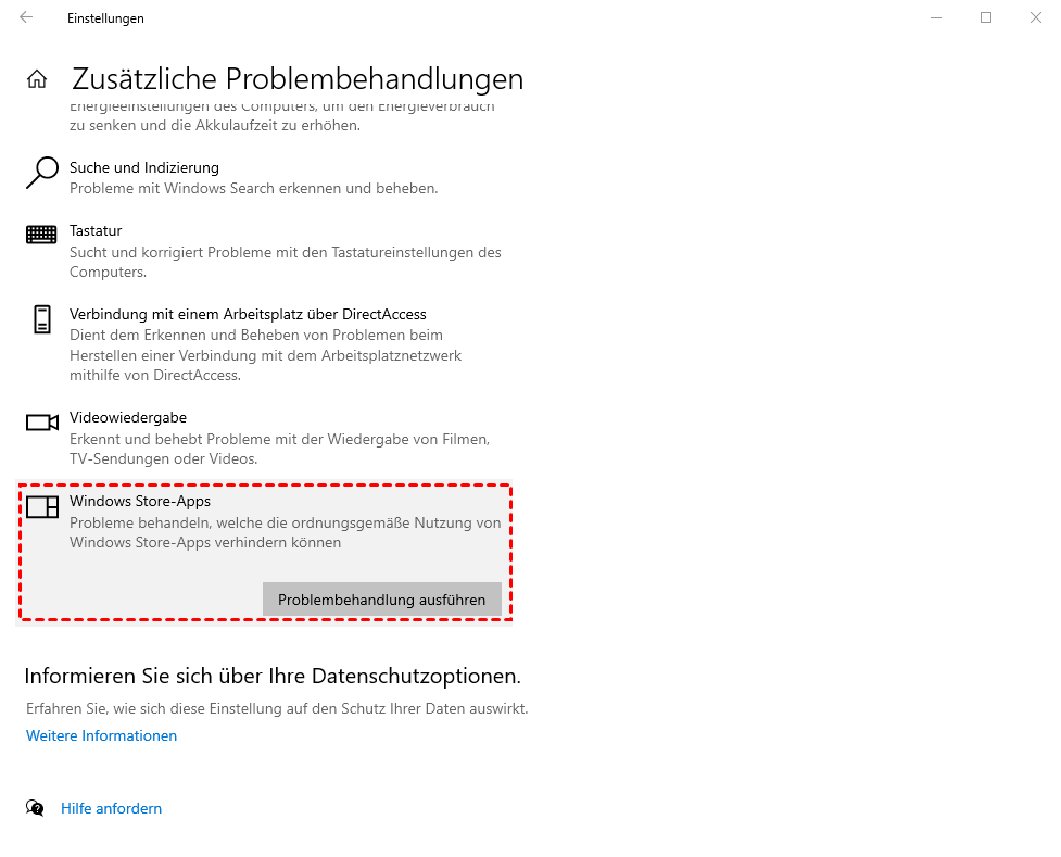 Schritt 3. Wählen Sie aus der Liste „Windows Store-Apps“ und „Problembehandlung ausführen“.