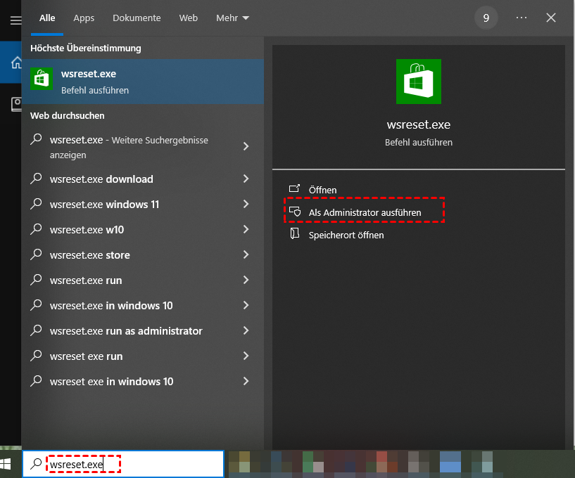 Schritt 1. Geben Sie wsreset.exe in die Windows-Suchleiste ein, klicken Sie mit der rechten Maustaste auf die beste Übereinstimmung und wählen Sie „Als Administrator ausführen“.