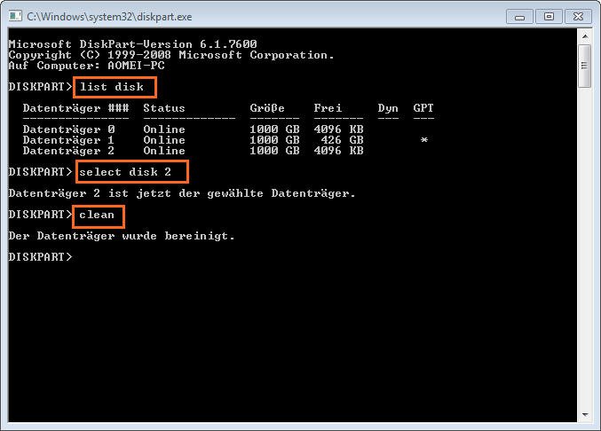 - select disk X („X“ ist die Datenträgernummer, die Sie löschen möchten.)