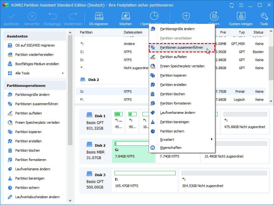 Wenn Sie das Problem „Eine neue Partition konnte nicht erstellt werden“ beheben wollen, können Sie auch die Drittanbieter-Software AOMEI Partition Assistant verwenden, um die Partitionen zusammenzuführen, ohne Daten zu verlieren.