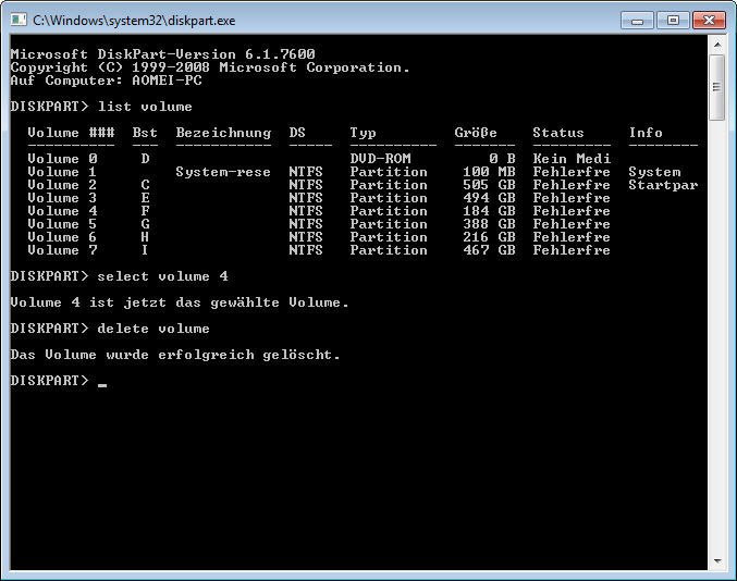 - select volume X („X“ stellt das zu löschende Volume dar.)