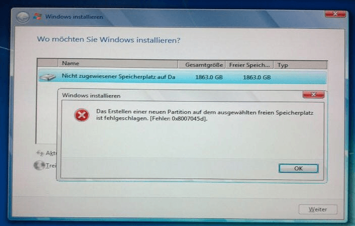 Das Erstellen einer neuen Partition auf dem ausgewählten freien Speicherplatz ist fehlgeschlagen. [Fehler: 0x8007045d]. Unter bestimmten Umständen können Sie auch den Fehler 0x8004240f oder den Fehler 0x80042468 bekommen.