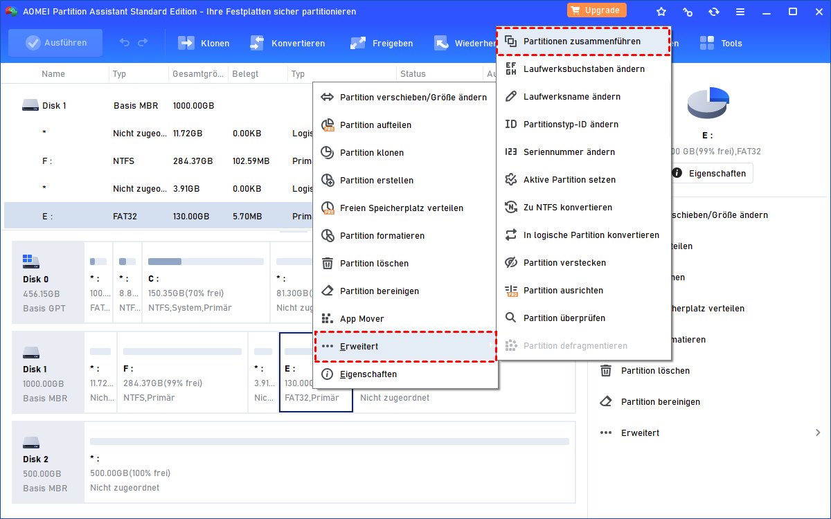 2. Klicken Sie in der Hauptschnittstelle mit der rechten Maustaste auf eine der beiden zu zusammfenführenden Partitionen und wählen Sie „Erweitert“ ⇨ „Partitionen zusammenführen“, mit denen Sie zwei benachbarte Partitionen in eine zusammenführen oder den nicht zugeordneten Speicherplatz mit einer der vorhandenen Partitionen zusammenführen können.