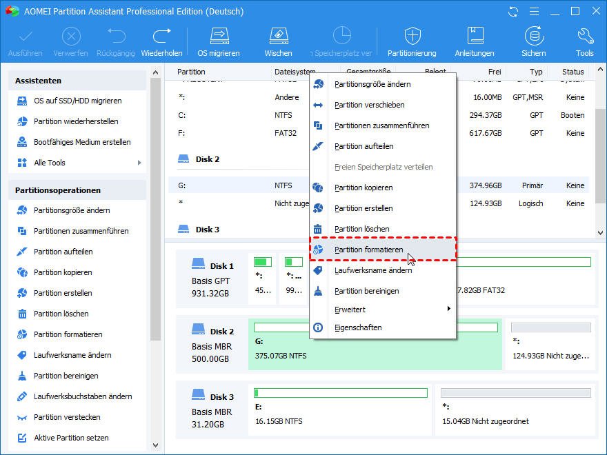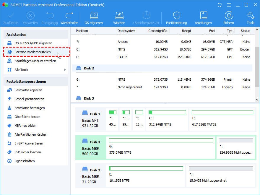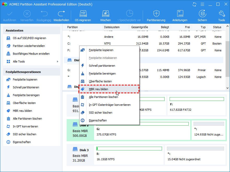 Wenn das Problem durch einen beschädigten MBR verursacht wird, ist es wichtig, den MBR dieses Geräts zu reparieren. AOMEI Partition Assistant bietet auch die Funktion: MBR neu bilden.