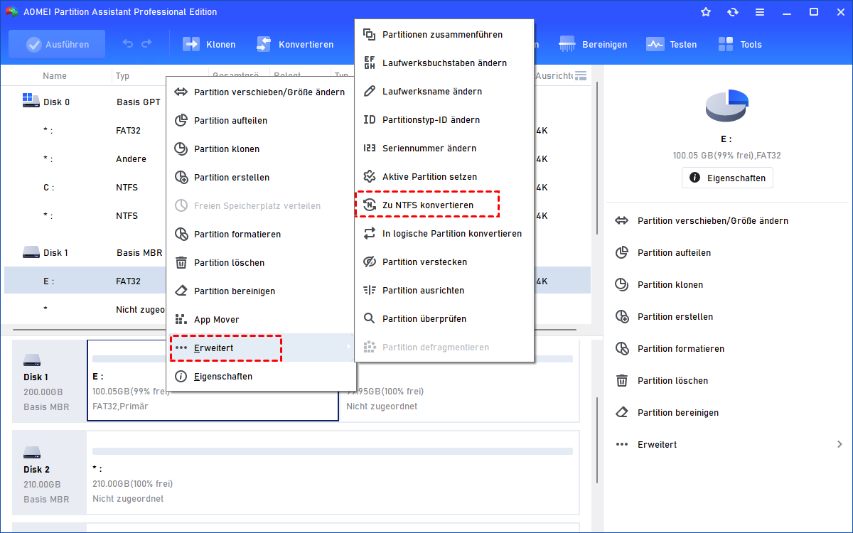Schritt 1: Installieren und starten Sie AOMEI Partition Assistant Standard. Klicken Sie mit der rechten Maustaste auf die mit FAT32 formatierte externe Festplatte und wählen Sie Erweitert und dann Zu NTFS konvertieren aus.