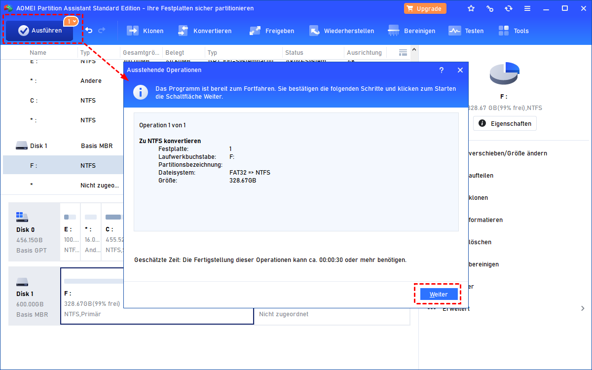 Schritt 3. Klicken Sie auf Weiter > Ausführen, um die FAT32-Größenbeschänkung zu umgehen.