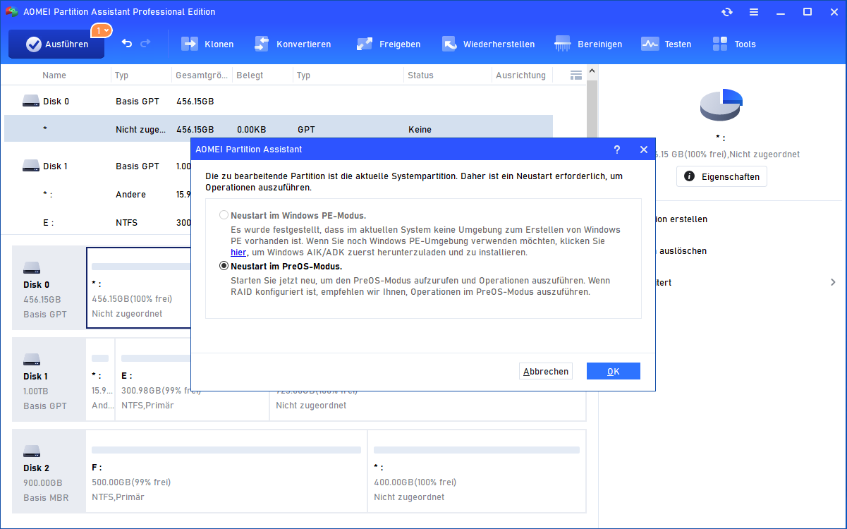● Pre-OS-Modus: Im Gegensatz zu anderen ähnlichen Tools kann AOMEI Partition Assistant direkt in den Pre-OS-Modus wechseln, um die Löschaufgabe auszuführen, sodass Sie kein zusätzliches Gerät benötigen, um eine Windows PE-Umgebung zu erstellen.