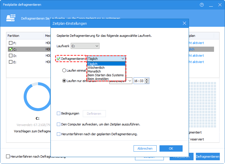 AOMEI Partition Assistant verfügt über eine Zeitplan-Defragmentierungsfunktion. Sobald Sie einen Zeitplan festgelegt haben, defragmentiert das Tool automatisch die Zielfestplatte.