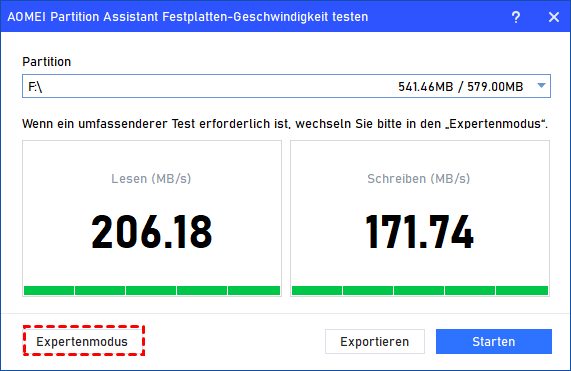 Die verschiedenen Testmodi zeigen unterschiedliche Testergebnisse an. Der Expertenmodus enthält mehr Details über das getestete Laufwerk, damit Sie die Festplattenleistung besser beurteilen können.