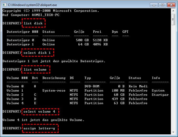 Manchmal kann der Verlust der Datenträgerbezeichnung, des Laufwerkbuchstabens, des Partitionsnamens oder der Diskpart Clean-Befehl zum Verlust der Partition führen. Wenn dies die Ursache für die Partitionsverluste ist, können Sie versuchen, Laufwerksbuchstaben mithilfe von Diskpart zuzuweisen. Diese Operation kann mit CMD den Diskpart Clean-Befehl rückgängig machen.