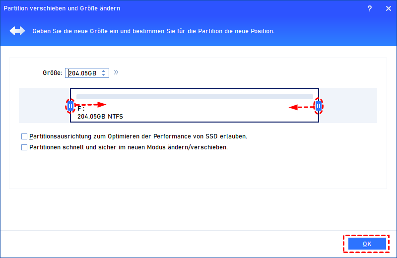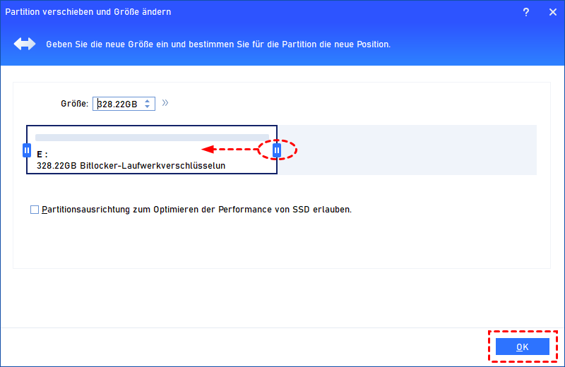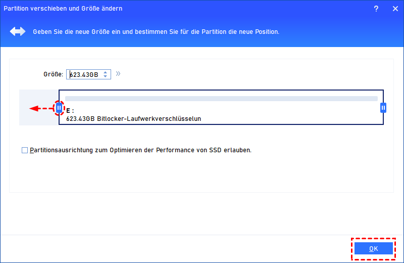 - Wenn sich die BitLocker-Partition links von der ausgewählten Partition befindet, ziehen Sie sie bitte nach rechts, um nicht zugeordneten Speicherplatz hinter dem BitLocker-Speicherplatz zu erstellen.