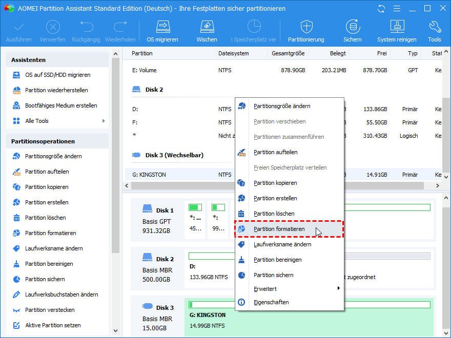 Schritt 2. Installieren und führen Sie AOMEI Partition Assistant Standard aus, die eine Freeware ist. Wählen Sie Ihren Kingston UBS-Stick (hier ist Partition G: auf Disk 3), klicken Sie mit der rechten Maustaste auf Partition G:, und wählen Sie Partition formatieren.