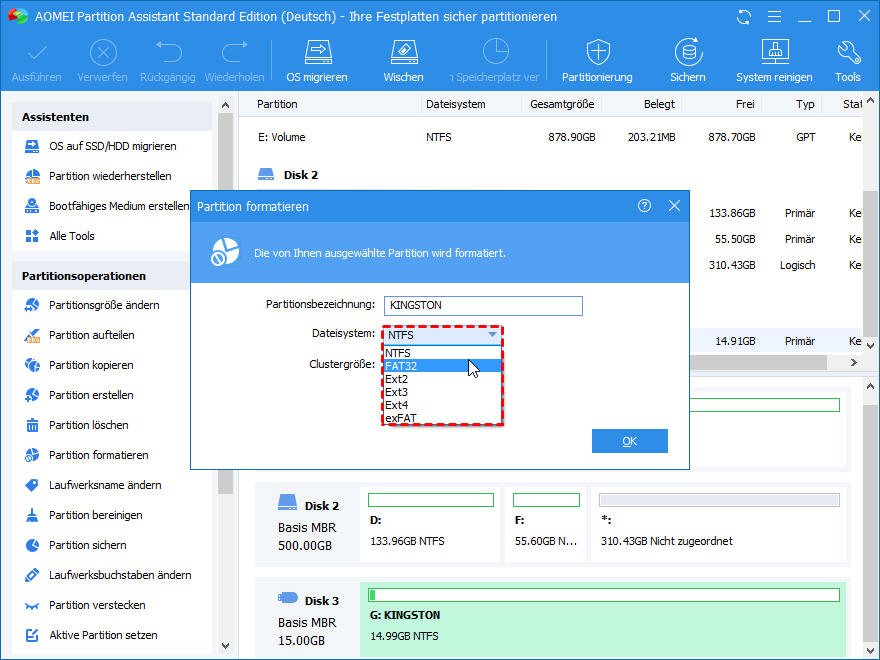 Natürlich kann AOMEI Partition Assistant dazu beitragen, den Schreibschutz von Kingston USB oder anderen Marken-USB-Laufwerken zu entfernen, indem er die Formatierung erzwingt. Außerdem bietet es große Hilfen für Ihre Partitionsverwaltung, einschließlich Klonen von Partition/Festplatte, Zusammenführen von Partitionen, Verschieben von Partitionen und Löschen von Festplatten, Erstellen bootfähiger Medien usw.