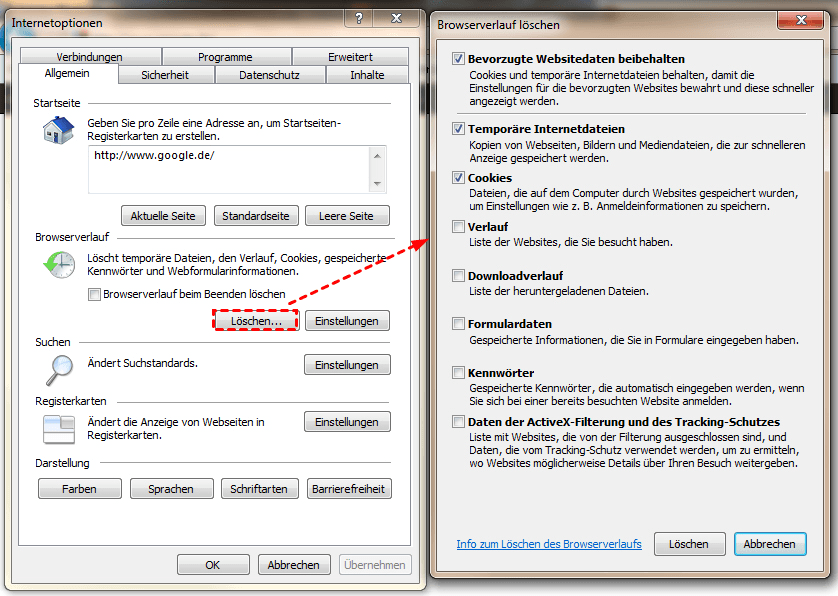 2. Dann wird das Fenster „Internetoptionen“ angezeigt. Klicken Sie auf Löschen, und es öffnet sich das Fenster Browserverlauf löschen, in dem Sie temporäre Dateien, den Verlauf, Cookies usw. löschen können.