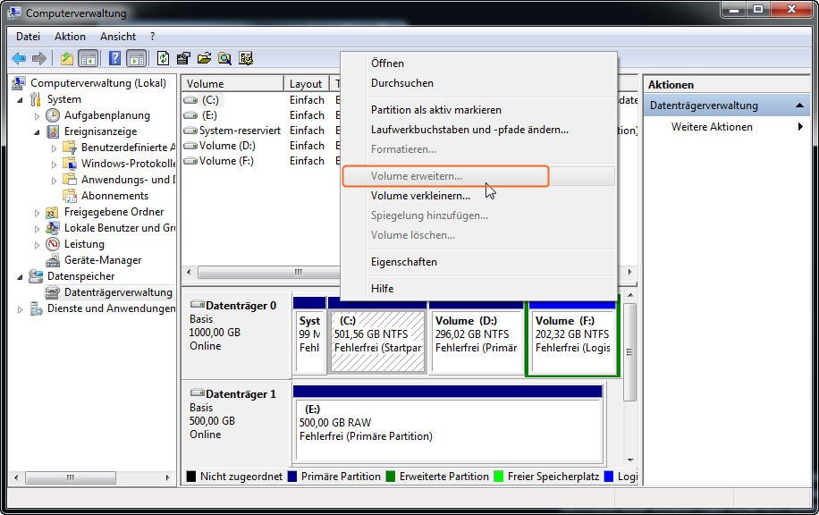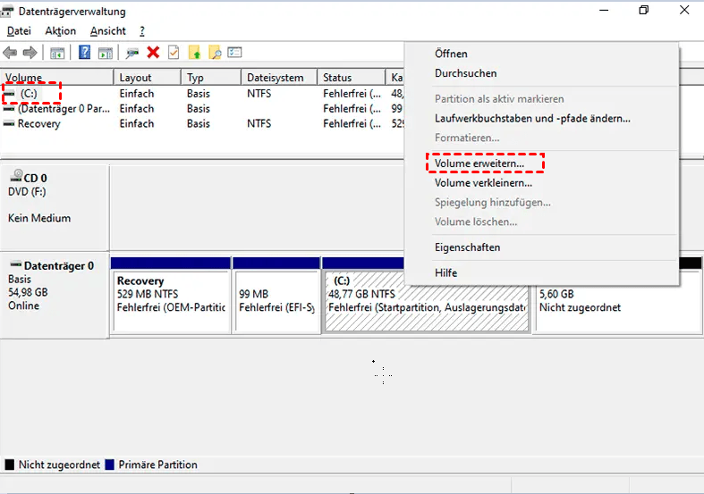 Die Windows eingebaute Datenträgerverwaltung verfügt über viele Funktionen, um Ihre Festplatte zu verwalten, z.B. Volume erweitern, Volume verkleinern, Partition formatieren usw. Sie können nach Ihren Wünschen die C-Partition erweitern, indem Sie die Funktion „Volume erweitern“ verwenden.