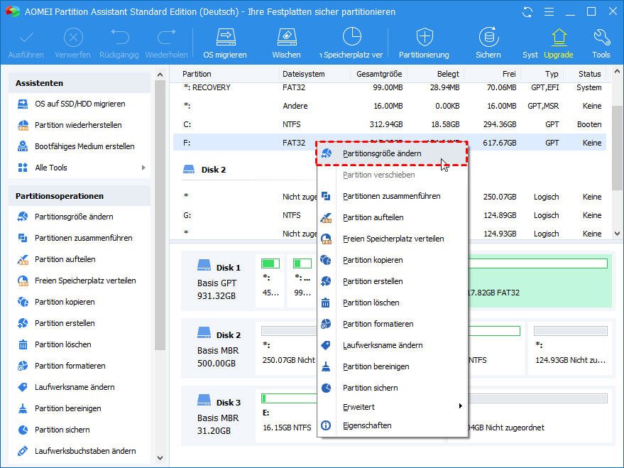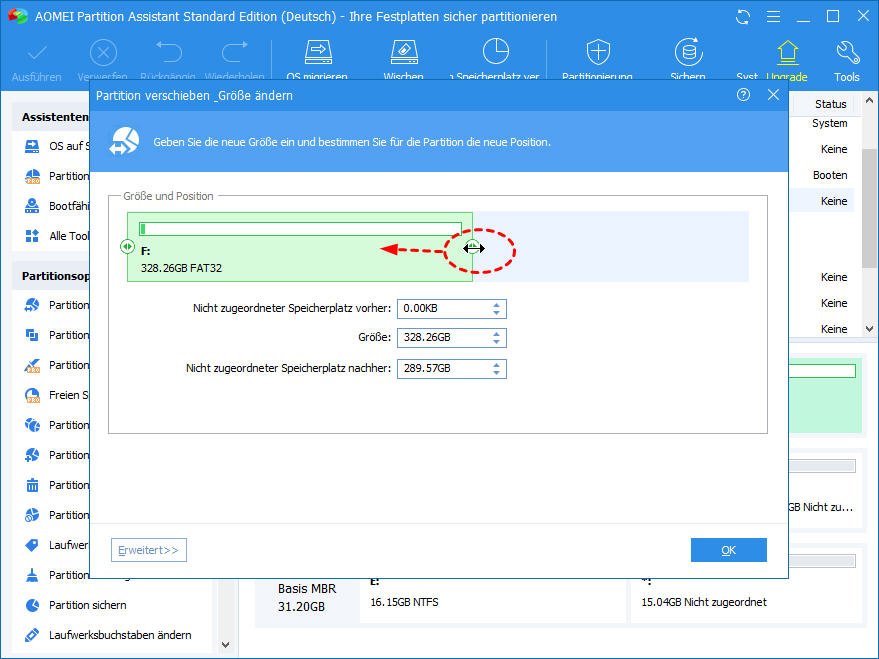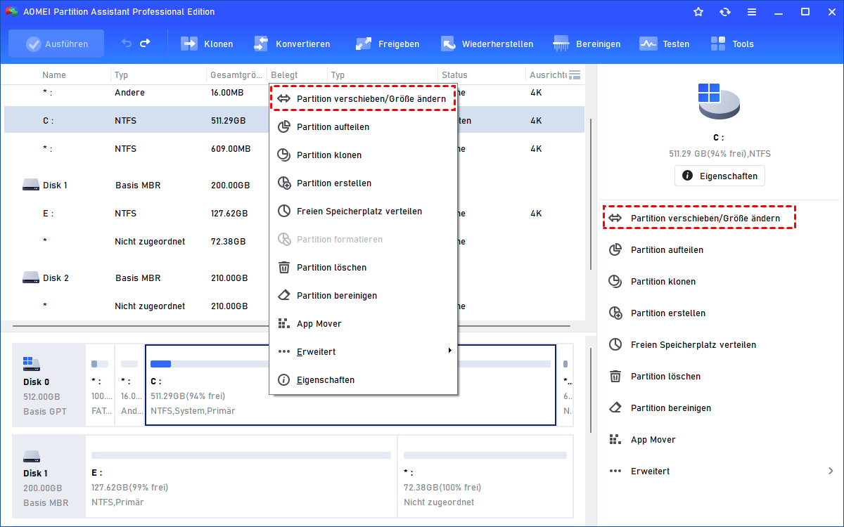 ➤ Die Funktion zum Erweitern/Verkleinern der Partition wird durch die Funktion „Partitionsgröße ändern“ realisiert, die davon abhängt, ob ein nicht zugeordneter Speicherplatz vorhanden ist oder nicht.