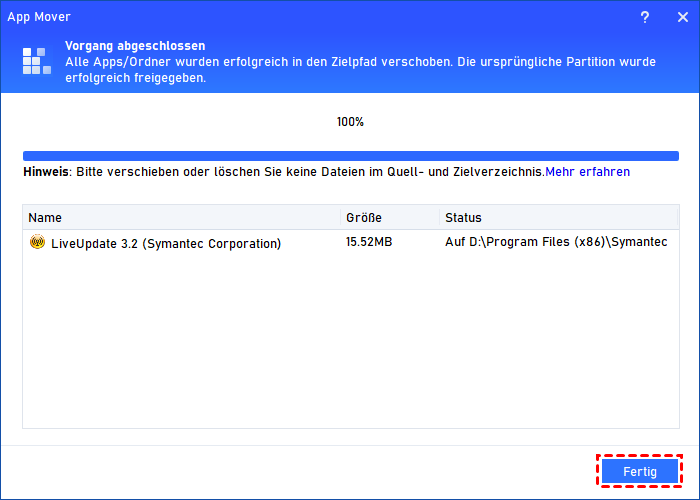 Schritt 5. Warten Sie, bis der Verschiebevorgang abgeschlossen ist. Klicken Sie dann auf Fertig.