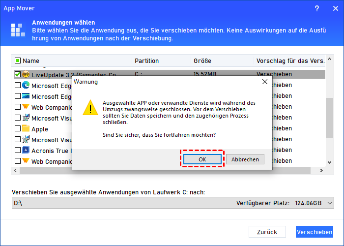Schritt 3. Im Fenster werden alle beweglichen Apps auf Laufwerk C aufgelistet. Sie können eine oder mehrere Apps auswählen, die Sie verschieben müssen, und die Zielpartition (hier wähle ich Laufwerk E). Klicken Sie dann auf Verschieben, um den Vorgang auszuführen.