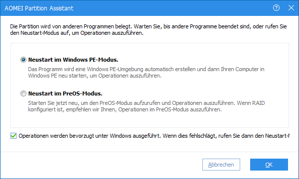 ◈ Wenn einige Programme auf der Partition laufen, wird Partition Assistant ein Dialogfeld öffnen, um Sie aufzufordern, im PreOS-Modus zu arbeiten.