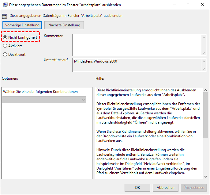 3. Suchen Sie dann im rechten Fenster nach „Diese angegebenen Datenträger im Fenster „Arbeitsplatz“ ausblenden“. Öffnen Sie es, vergewissern Sie sich, dass es „Nicht konfiguriert“ ist, und klicken Sie auf „OK“.