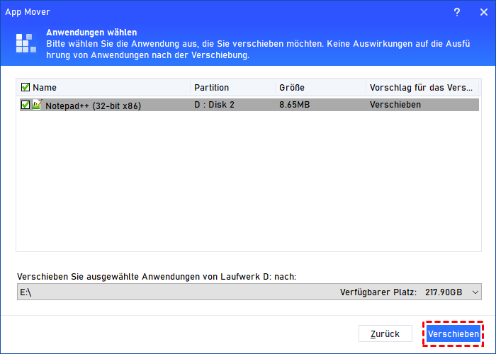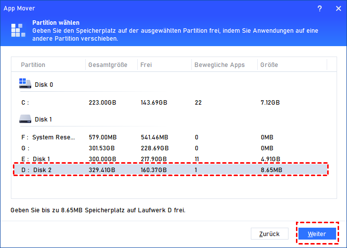 Schritt 3: Alle verschiebbaren Anwendungen in der D-Partition werden aufgelistet. Sie können auswählen, was Sie verschieben möchten, den Zielordner unten wählen und dann auf Weiter klicken.