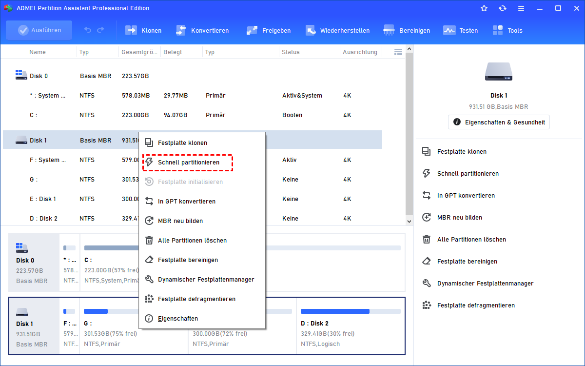 Wenn Sie mehrere Partitionen erstellen möchten, können Sie die Funktion „Schnell partitionieren“ verwenden, um auf einmal bis zu 10 Partitionen zu erstellen. Wenn sich bereits eine Partition auf dem Ziel-Datenträger befindet, wird diese durch „Schnell partitionieren“ entfernt, was zu Datenverlust führt. Machen Sie also zuerst eine Sicherungskopie. Beim schnellen Partitionieren einer Festplatte können Sie die Größen frei anpassen und ihre Bezeichnungen ändern.