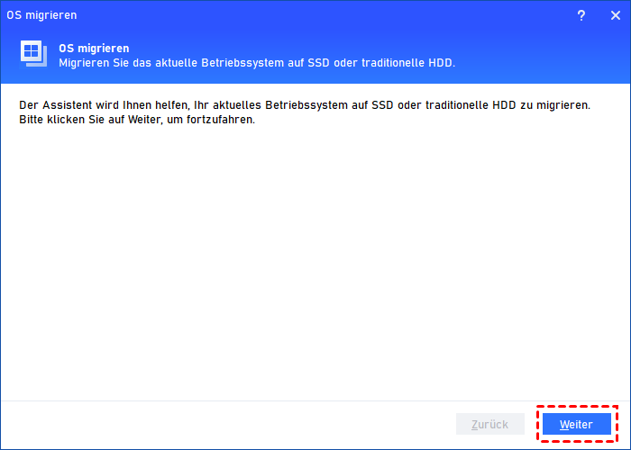 Schritt 1. Installieren und starten Sie AOMEI Partition Assistant. Klicken Sie im oberen Menü auf „Klonen“ und „OS migrieren“. Sie sehen eine Einführung zu diesem Assistenten, lesen Sie diese und klicken Sie auf „Weiter“.