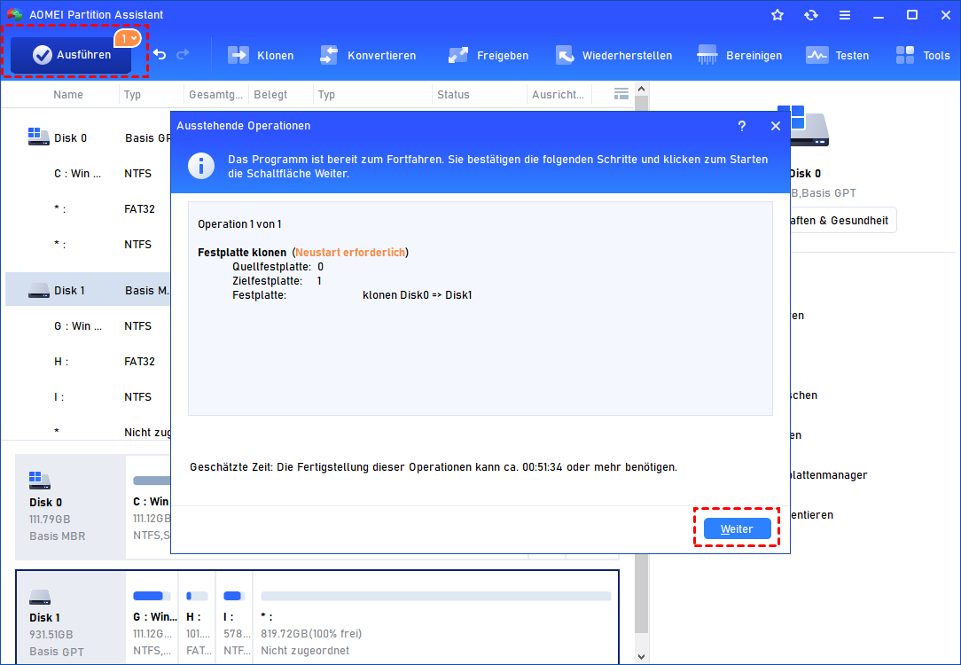 Schritt 6. Sie gelangen automatisch zur Hauptkonsole. Klicken Sie auf Ausführen und Weiter, um den SSD-Klonvorgang auszuführen.