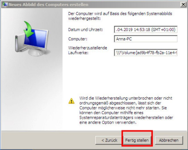 Sobald der Vorgang abgeschlossen ist, erstellt das Tool ein Image des gesamten Systems, das alles auf der primären Festplatte und anderen Laufwerken enthält, die Sie möglicherweise ausgewählt haben. Dann können Sie das Image auf der Ziel-HDD oder -SSD wiederherstellen.
