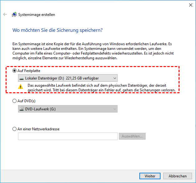 Schritt 5. Wählen Sie die Option „Auf Festplatte“. Wählen Sie im Dropdown-Menü den Speicherort von der vollständigen Windows-Sicherung aus und klicken Sie auf „Weiter“. Sie können auch „An einer Netzwerkadresse“ auswählen, um Windows an einem Netzwerkspeicherort zu sichern.