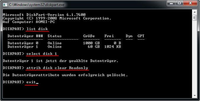 Über Diskpart den SD-Karte Schreibschutz aufheben