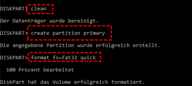 • format fs=fat32 (oder format fs=ntfs/exfat.)