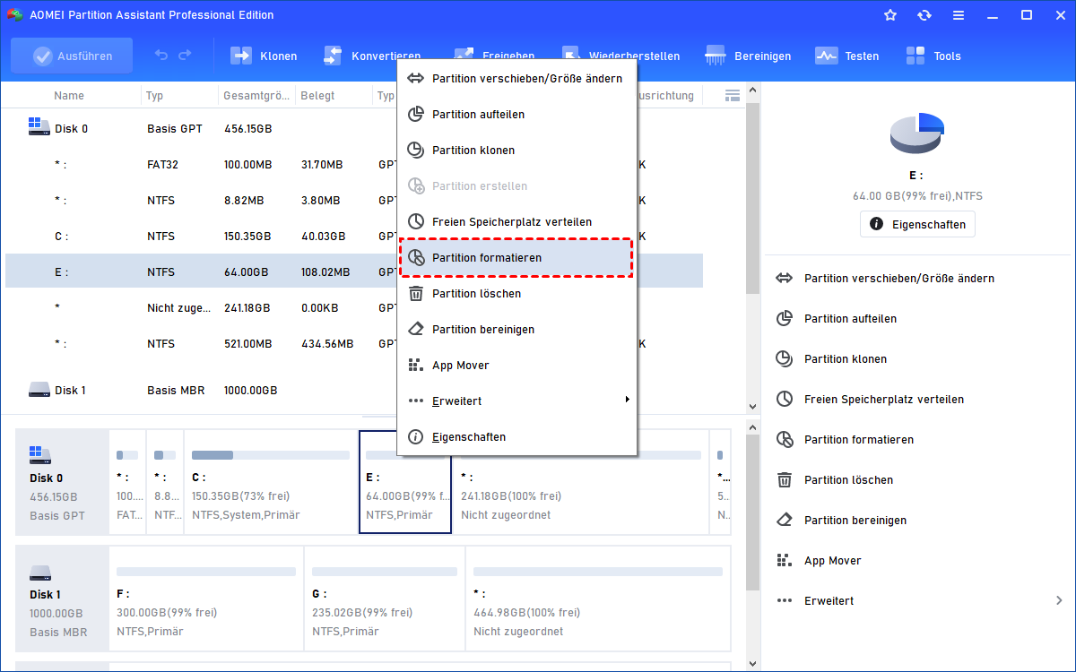 Glücklicherweise gibt es ein benutzerfreundliches und leistungsstarkes Formatierungswerkzeug - AOMEI Partition Assistant, mit dem Sie eine SD-Karte auf einer intuitiven Oberfläche in exFAT, FAT32, NTFS und Ext2, Ext3, Ext4 formatieren können. In nur wenigen Schritten können Sie Ihre SD-Karte oder Micro-SD-Karte ganz einfach formatieren. Laden Sie dieses Tool herunter und folgen Sie der Anleitung, um zu sehen, wie Sie es verwenden können.