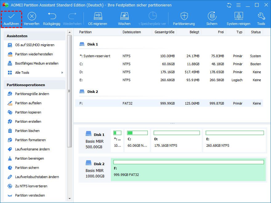 Natürlich können Sie die Festplatte über die Datenträgerverwaltung oder Software von Drittanbietern formatieren. Hier empfehle ich Ihnen einen Partition-Manager namens AOMEI Partition Assistant, der Ihnen verschiedene Optionen im Dateisystem bietet und es Ihnen ermöglicht, Partitionen größer als 32 GB als FAT32 zu formatieren. Sehen Sie sich die detaillierten Schritte an, die wie folgt dargestellt werden: