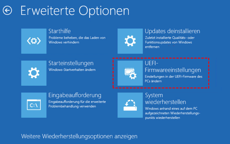 Schritt 2. Klicken Sie im blauen Bildschirm mit dem erweiterten Menü auf „Problembehandlung > Erweiterte Optionen > UEFI-Firmwareeinstellungen“.