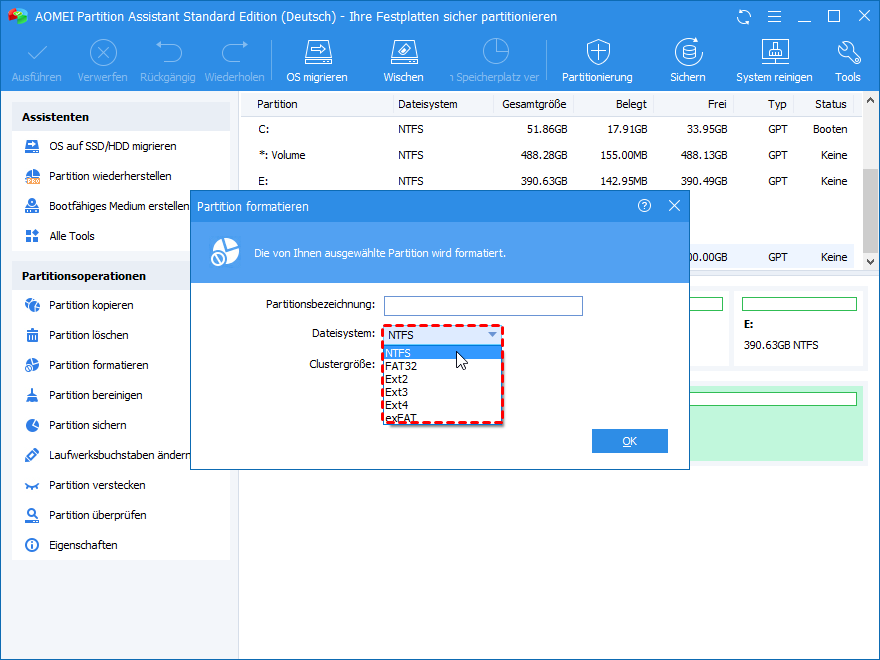 Um die Formatierung auf einfache Weise durchzuführen, können Sie AOMEI Partition Assistant auswählen. Sie können damit SSD, HDD, USB-Stick, USB-Stick oder SD-Karte in NTFS, exFAT, FAT32, Ext2, Ext3 oder Ext4 formatieren, auch wenn in der Datenträgerverwaltung Ihre Festplatte als RAW angezeigt wird.