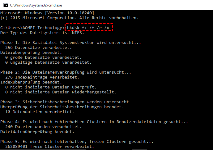 In einigen Fällen werden Sie jedoch vielleicht die Fehlermeldung „Die Datenträgerprüfung kann auf diesem Volume nicht ausführt werden, da es schreibgeschützt ist“ erhalten. Wenn dies der Fall ist, können Sie einen anderen Befehl „chkdsk f: /f /r /x“ versuchen, um den Schreibschutz auf dem SSD-Laufwerk zu entfernen.