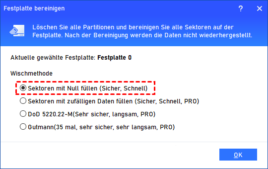 Schritt 2. Wählen Sie die erste Methode „Sektoren mit Null füllen“, um Ihre Festplatte zu bereinigen. Klicken Sie dann auf „OK“.