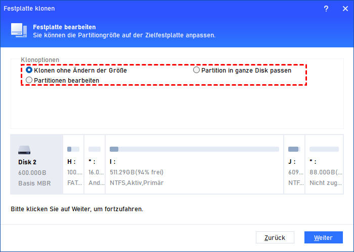Beim Klonen einer kleineren Festplatte auf eine größere Festplatte stehen drei Optionen zur Verfügung. Um zu vermeiden, dass nach dem Klonen Speicherplatz frei wird, können Sie „Partitionen in ganze Disk passen“ wählen, wodurch der gesamte Speicherplatz des größeren Datenträgers auf mehrere Partitionen entsprechend der Partitionsgröße der Quellfestplatte verteilt wird.