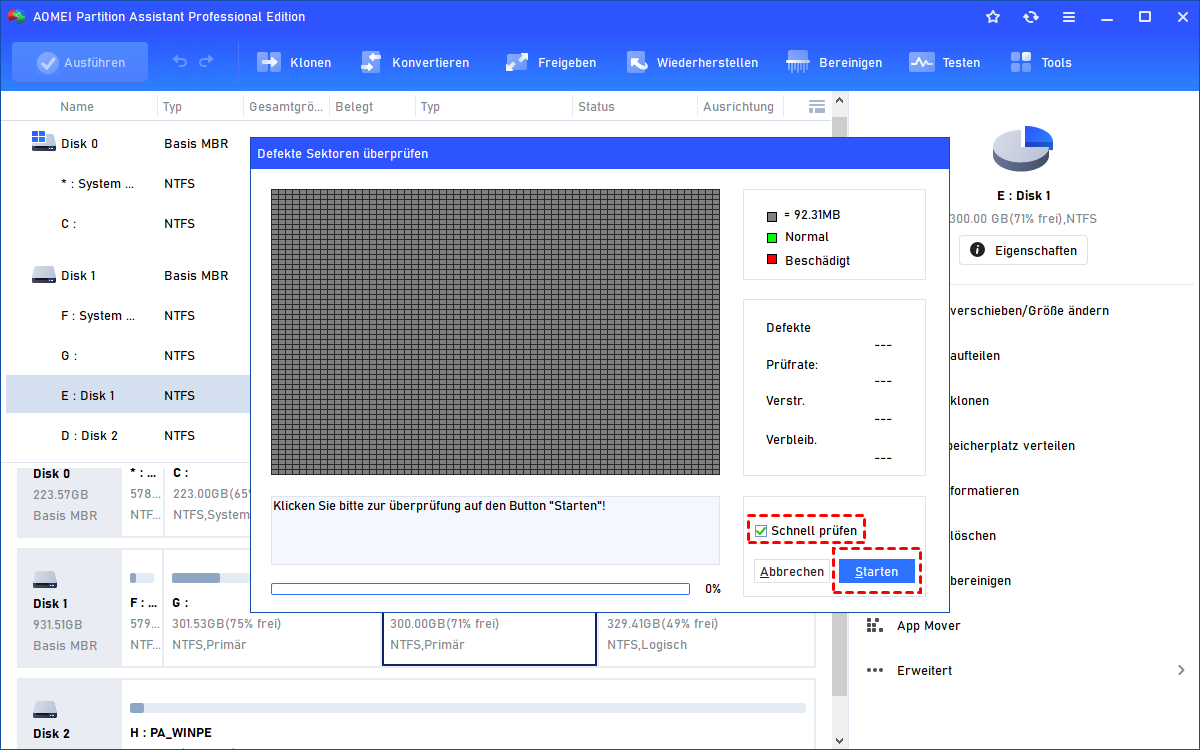 Daher empfehlen wir hier einen leistungsstarken Partitionsmanager für diese Aufgabe: AOMEI Partition Assistant Professional. Es kann Ihnen helfen, Festplattenfehler mit wenigen Klicks zu überprüfen, anstatt komplexe Befehle auszuführen. Windows 7, 8/8.1, 10, 11, XP/Vista werden unterstützt. Als nächstes erfahren Sie, wie Sie mit dieser Software in Windows 10 fehlerhafte Sektoren auf der Festplatte überprüfen.