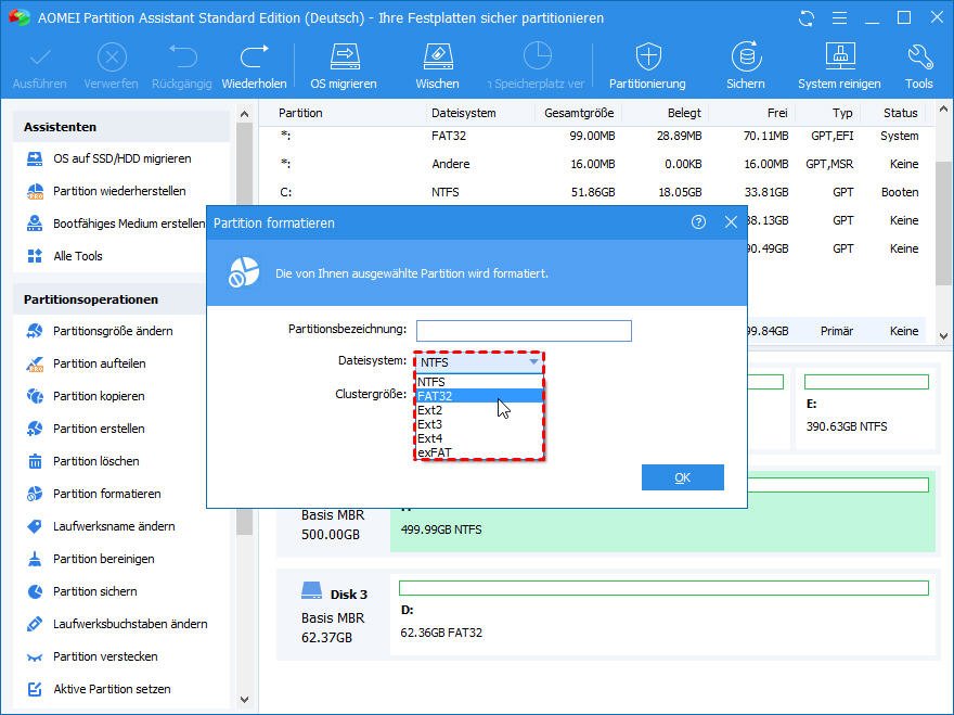 Schritt 5. Wählen Sie ein entsprechendes Dateisystem für diese Partition, klicken Sie auf OK, um weiterzugehen.