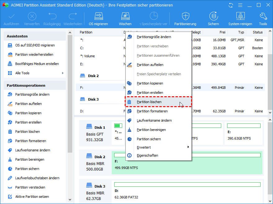 Schritt 1. Starten Sie das Programm, und klicken Sie mit der rechten Maustaste auf die Partition der verschlüsselten Festplatte und wählen Sie Partition löschen.