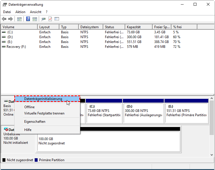Nach dem Erstellen erscheint das Laufwerk als „Nicht zugeordnet“. Klicken Sie mit der rechten Maustaste → „Datenträgerinitialisierung“ → und folgen Sie dem Assistenten.
