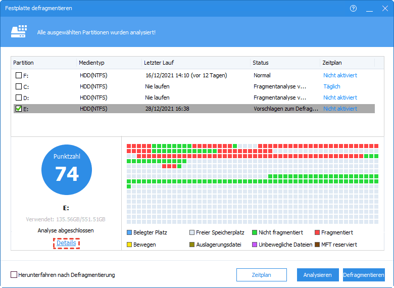 - Normal: Score≥90. Die Partition befindet sich in einem guten Zustand und muss nicht defragmentiert werden.